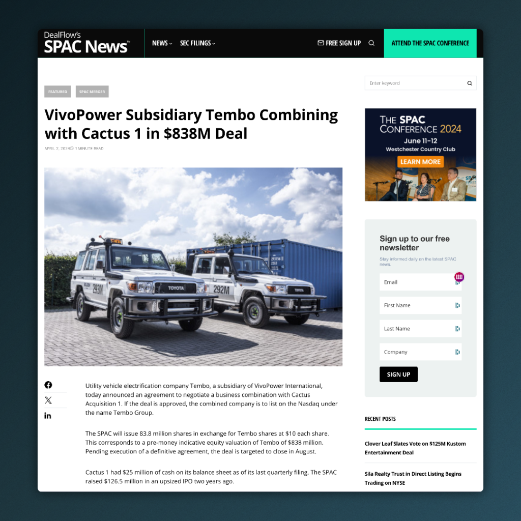VivoPower Subsidiary Tembo Combining with Cactus 1 in $838M Deal